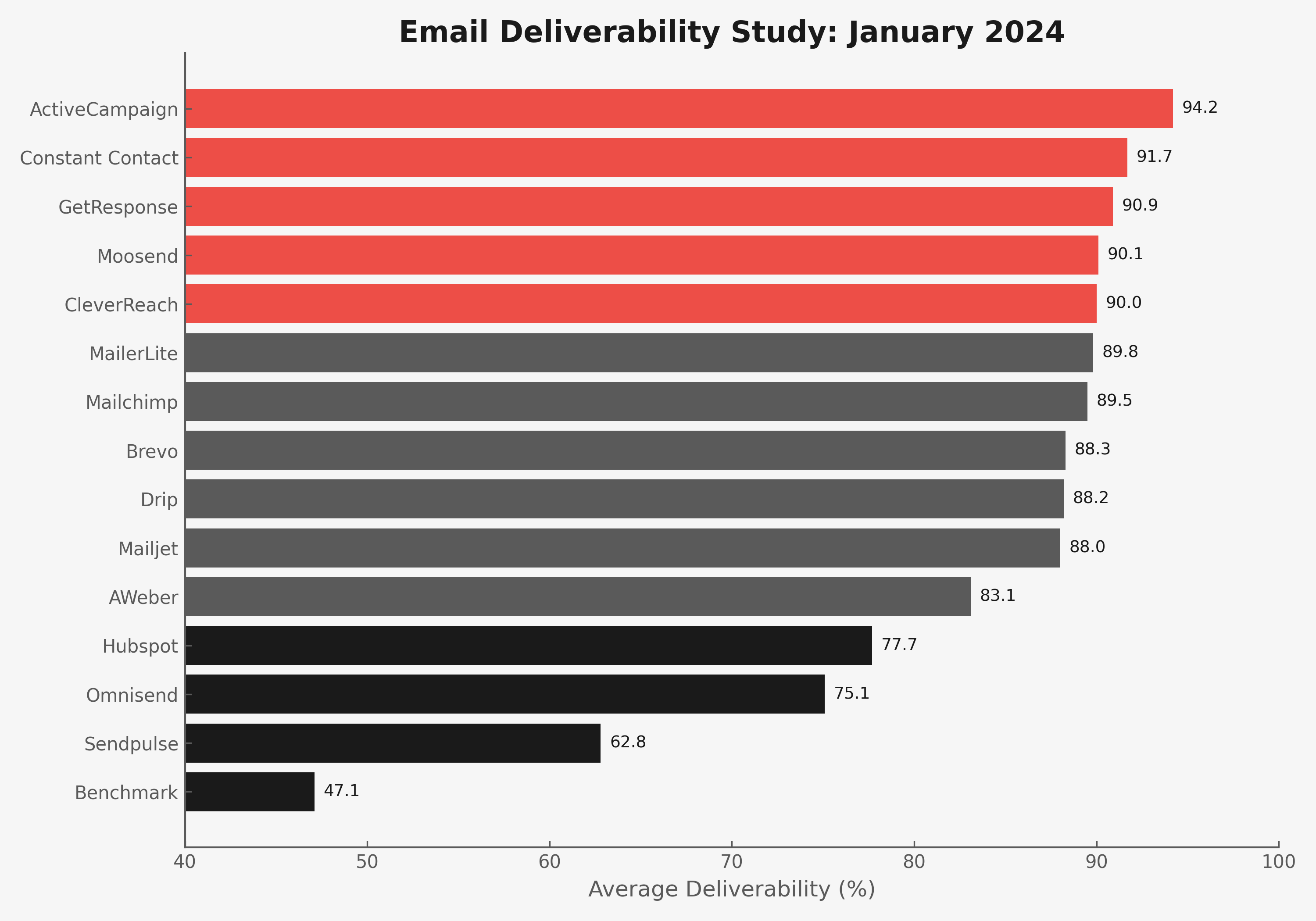 - Benchmark Email: Consistently underperforms, with an average deliverability rate of 47.1% in 2024 tests, the lowest among 15 platforms. A staggering 14.8% of emails were flagged as spam, and 22.3% went missing entirely, making it a risky choice for campaigns where inbox placement is critical.
