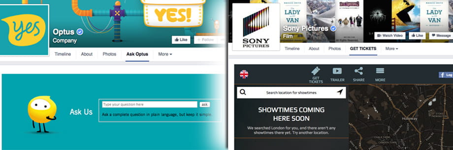 Examples of Custom tabs in use on the Facebook pages of mobile carrier OPTUS and Film distributor/studio
