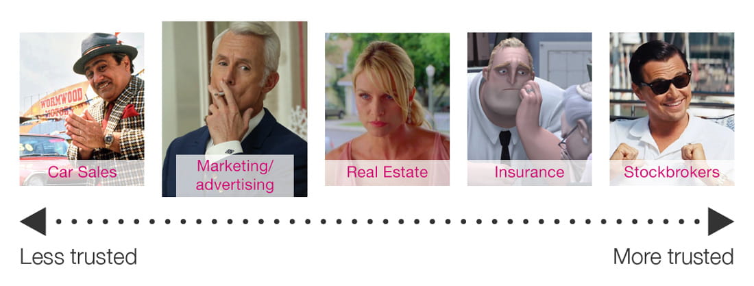 Unfortunately, that’s not the only thing that’s changed in marketing. The industry has taken quite a beating in the reputation department. Thanks to Don Draper types such as those portrayed on Mad Men, marketing has developed a trust problem.