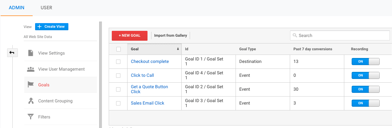 Goals are used to differentiate different types of conversions. This could be a product sale, new business lead generated via a phone call, or downloading a brochure. Events are small goals, such as spending a certain amount of time onsite, clicking a button, or watching a video through to completion. Being able to delineate URL-based goals and events helps with being able to attribute conversions to marketing efforts, as well as uncover opportunities to improve the user experience.