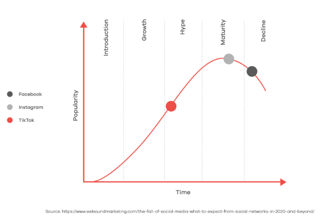 The life cycle starts with the introduction of a new platform, its growth from being a niche platform used largely by younger people, a phase of hype when adopted by mass market audiences, maturity and eventual decline.