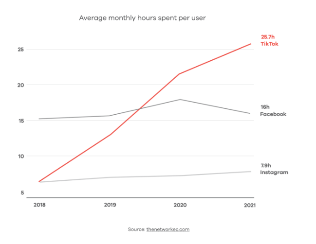 It’s not just the number of people using TikTok that’s impressive, it’s the amount of attention we’re all spending on the platform. Over the course of a month, people are spending three times longer viewing TikTok compared to Instagram, and nearly twice the time they are spending on Facebook.