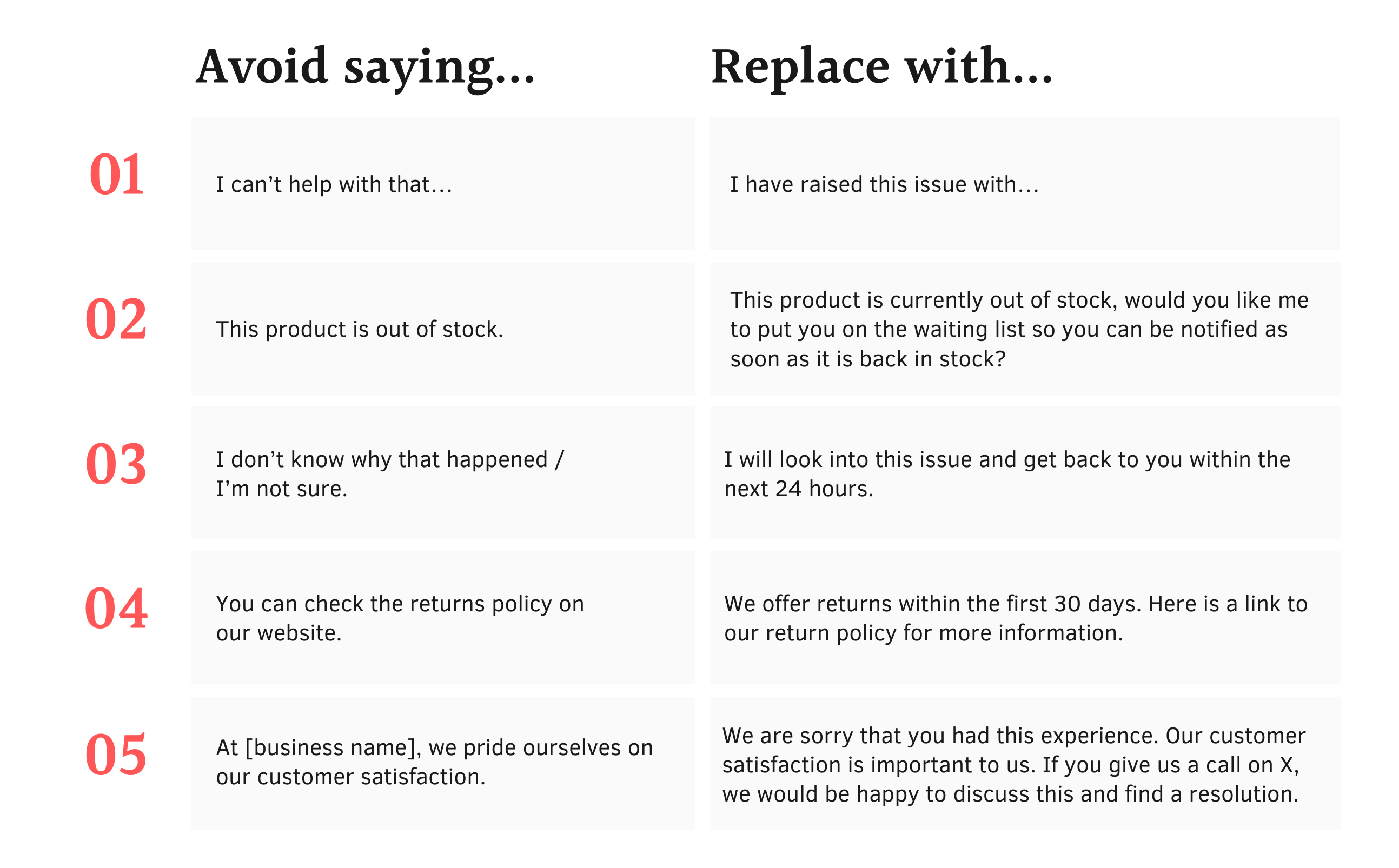 Avoid language such as “I can’t”, and “I don’t know” that suggests you cannot solve their problem, or you lack knowledge. Ensure your language is reassuring and proactive by using phrases such as “I can” and “I will”.