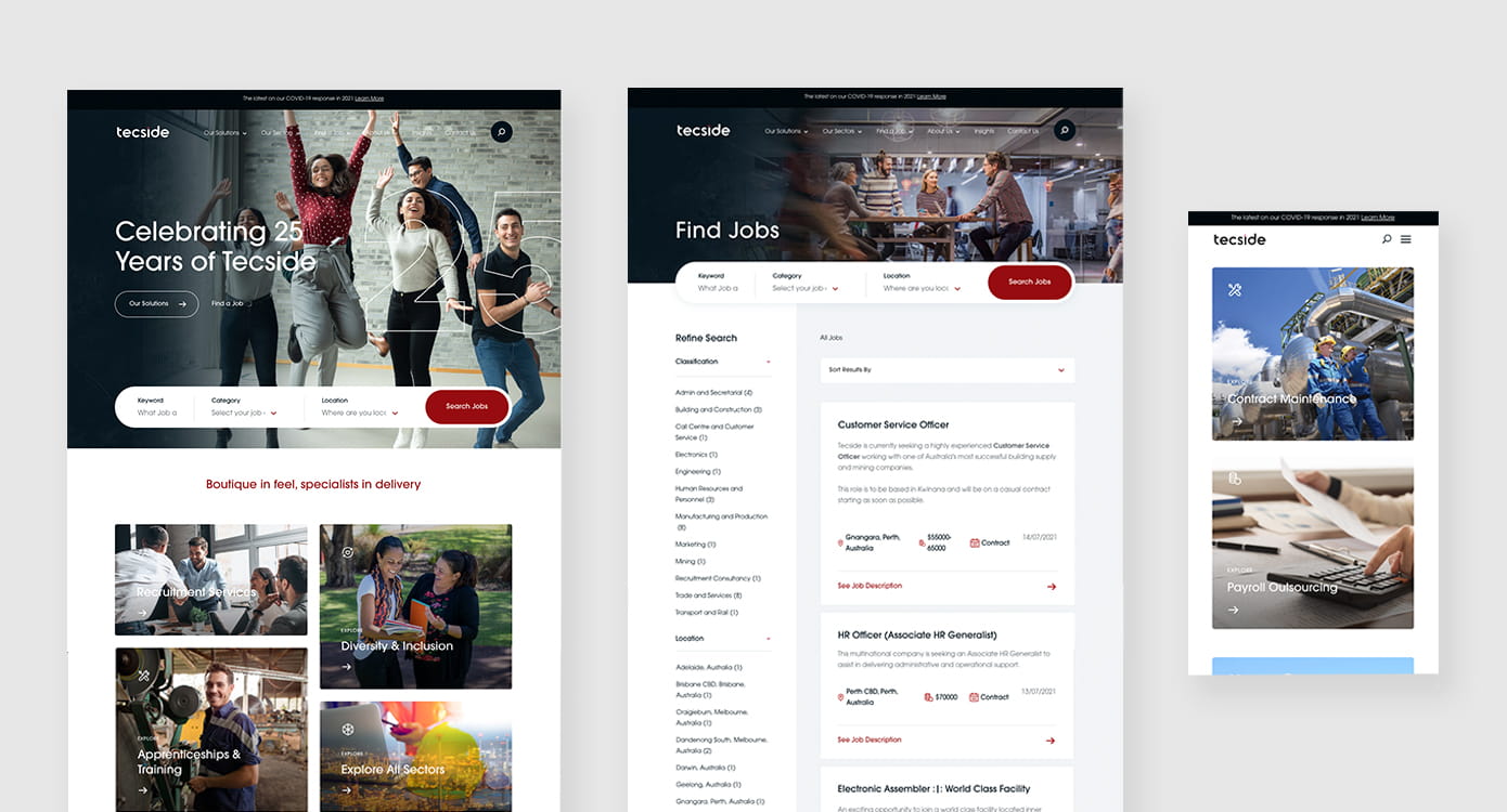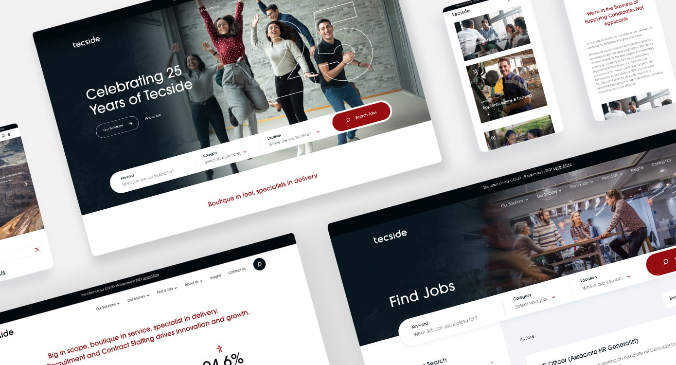 As a recruitment services firm, Tecside serves various distinct audiences and operates in a highly competitive market. We knew a key challenge would be designing a seamless website experience to meet the needs of each audience group. A technical challenge would be ensuring clean integrations between the website and specialist recruitment software used by Tecside.